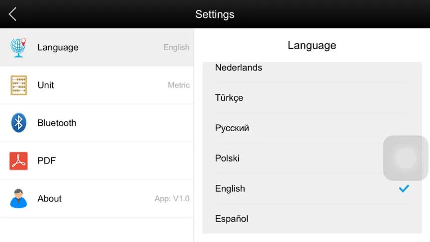 Settings: By selecting Setting users can set the language, unit and other system related options: