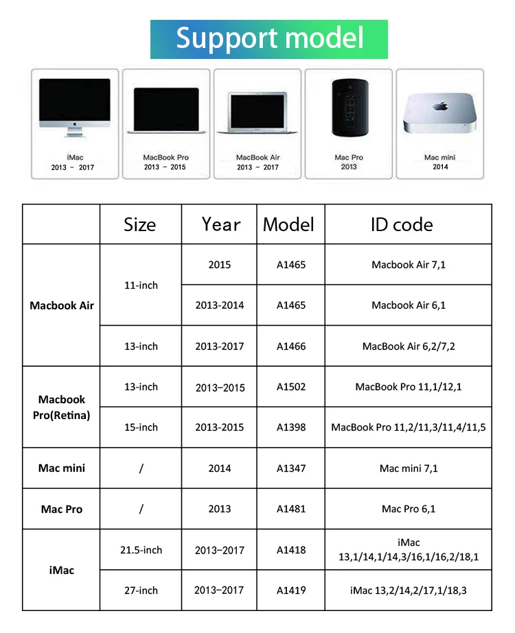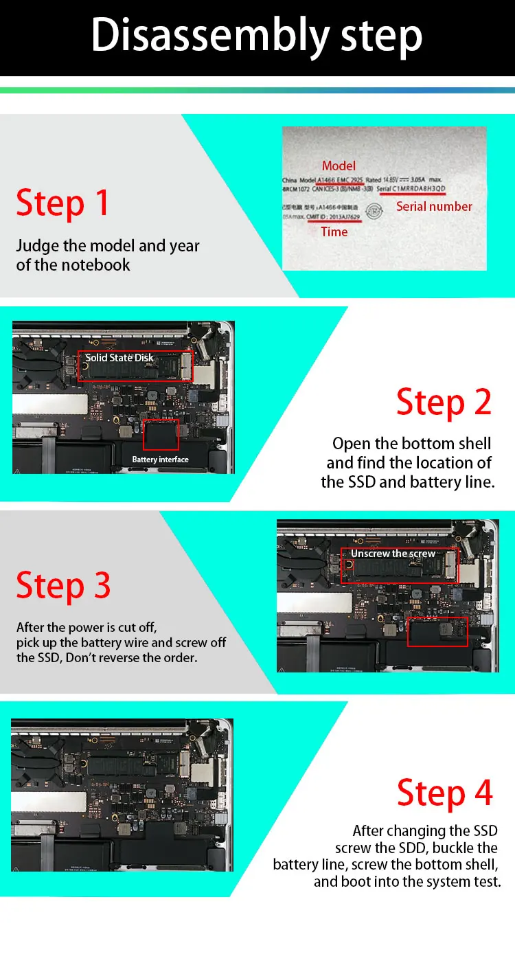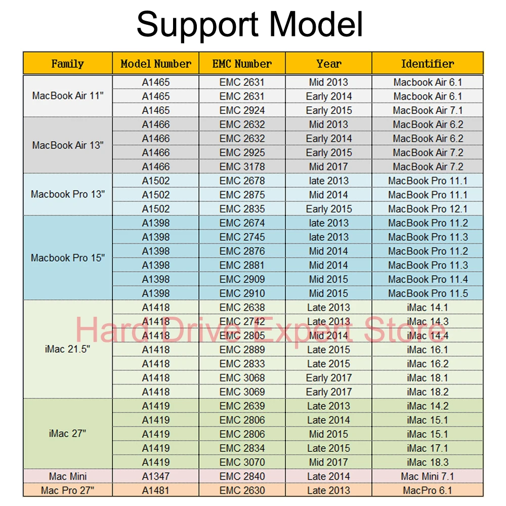 Important Notice: MacOS 10.13High Sierra (or later MacOS) must be installed on the host computer before installing the New ssd. These OS versions include an EFI firmware update for your host computer. Without the update, your new ssd will not function. When installing MacOS to your new ssd, boot and press Cmd-Opt-R, then follow the prompts, This will ensure the latest OS version is installed. First please confirm your laptop model then make an order, if you have any questions, please feel free to contact us. Includes: